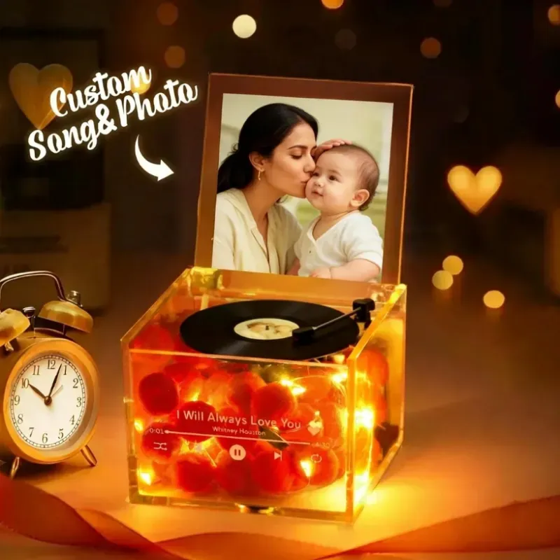 Regalo Per La Festa Della Mamma: Mini Giradischi In Vinile Personalizzato Per Lui Con Riproduzione Automatica Della Musica, Ricarica Usb, Foto E Luce Calda.